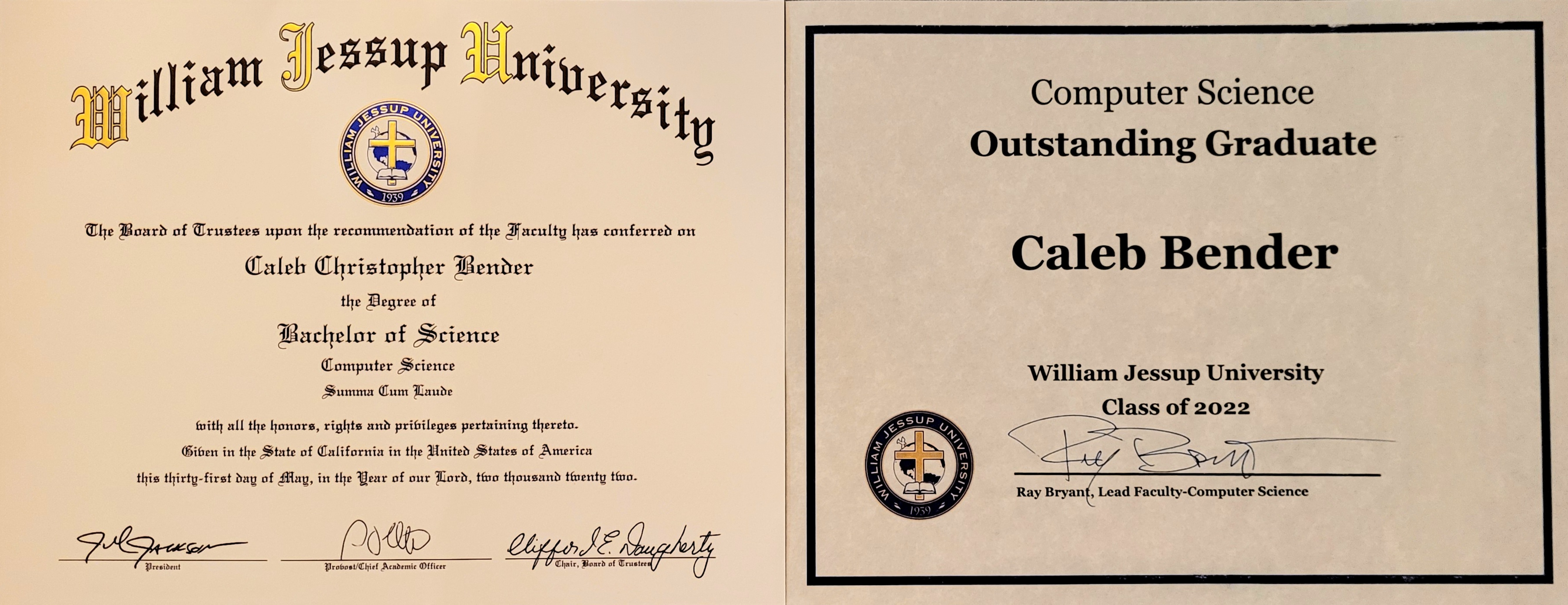 I graduated from William Jessup University Summa Cum Laude with a Bachelor of Computer Science and a Minor in Mathematics. Additionally, I was awarded the 2022 Outstanding Graduate Award for the College of Computer Science. Download degree and award